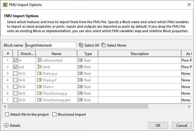 In the FMU Import Options dialog, specify which properties from the FMU file should be imported into your model as values and ports and Click OK.