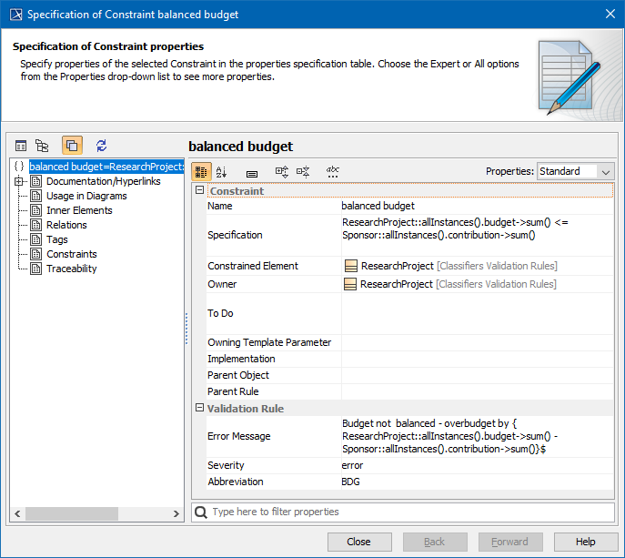 An example of a global validation rule can be found in the model validation sample model > Classifiers Validation Rules (2026x) Class diagram. You can find this sample at <modeling tool installation directory>\samples\product features\model validation.mdzip.