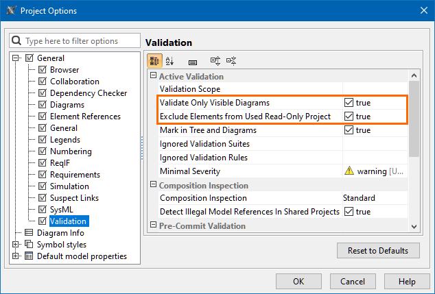 - Set the Validate Only Visible Diagrams project option to true to limit a validation scope to visible diagrams only. Since 2021x version, all projects are migrated to validate only visible diagrams. This is a key option to keep the modeling tool running smoothly while working on large models.