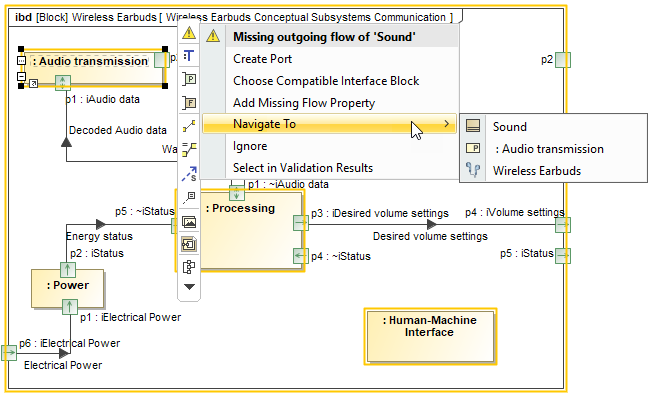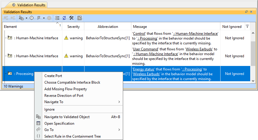 To learn more about the validated elements, in the smart manipulator toolbar of the Internal Block Diagram or Validation Results panel, select the Navigate To command to navigate to: