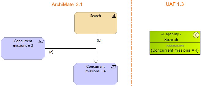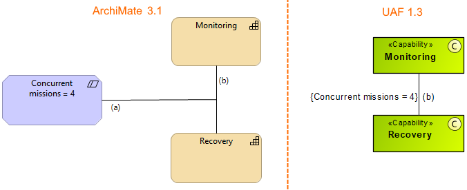 - If the ArchiMate Constraint has any relationship (a) with another relationship (b) (except for the relationship that connects the Constraint with any other ArchiMate relationship), then the Constraint will be applied to the imported UAF relationship (b) during the import process, and no relationship (a) will be created.