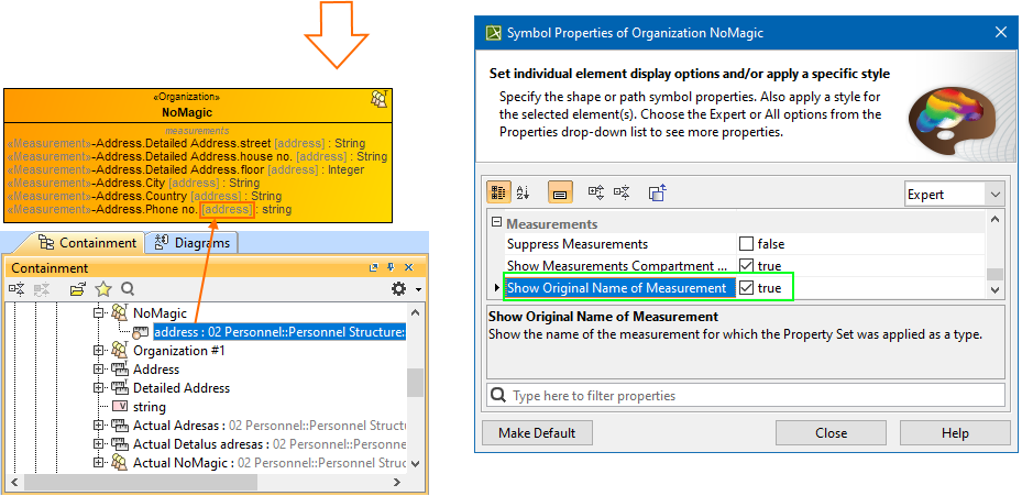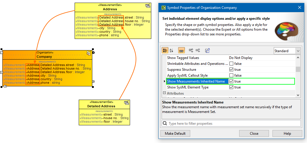 Note, that when you display the measurements in the measurements compartment, you can choose to show the inherited names through the dot notation when the Property Set is applied as a type. In this case, the original name of the measurements will no longer be shown. However, if you need to see the original name, set the Show Original Name of Measurement symbol property to true. The original name will be displayed in brackets and in gray font (see the image bellow).