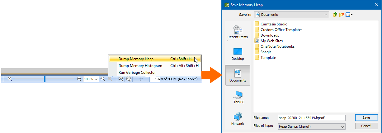 - Click anywhere on the Memory Monitor bar, select Dump Memory Heap, and then set the desired name and location of the memory heap file. By default, the name of the file is generated according to the current timestamp.
