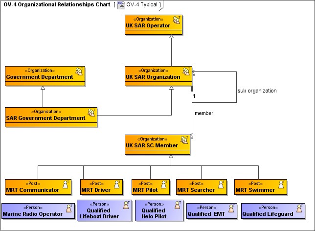 The Organizational Relationships Chart illustrates the command structure or relationships (as opposed to relationships with respect to a business process flow) among human roles, organizations, or organization types that are the key players in architecture. MODAF divides The OV-4 in two views: an OV-4 Typical and an OV-4 Actual. The former is exactly as the DoDAF OV-4, while the latter is a special form of the SV-1; where the resources are restricted to being organizational.