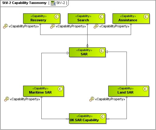 The view presents a hierarchy of capabilities. These capabilities may be presented in context of an Enterprise Phase, i.e. it can show the required capabilities for current and future enterprises. The StV-2 specifies all the capabilities that are reference throughout one or more architectures. In addition it can be used as a source document for the development of high-level use cases and Key User Requirements (KUR). The StV-2 also provides metrics against each capability that may be used to measure successfully fielded capability.
