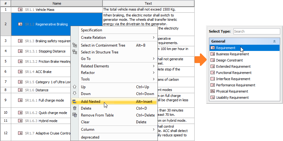 In the table, right-click the specific element to nest an additional element within, select Add Nested in the drop-down menu, and specify the type of the element to create, e.g., Requirement.