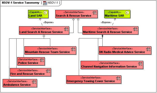 NSOV-1 is a service taxonomy, describing a specialization hierarchy of services (note these are classes of services, rather than the service implementations). There is no prescribed representation for this view, other than the ability to show multiple inheritances. The view may optionally show properties (for example, service availability) and constraints on those properties, though this is covered in detail in NSOV-2.