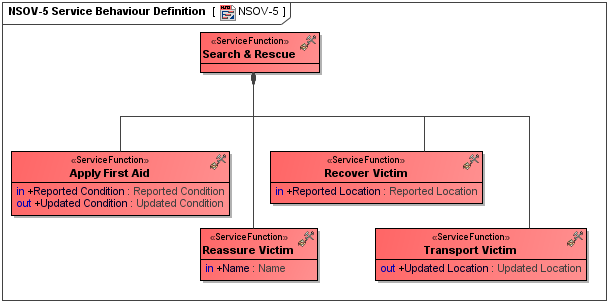 An NSOV-5 is the key behavioral specification for services. It is equivalent in nature to the NOV-5 and NSV-4. It specifies a set of functions that a service implementation is expected to perform.