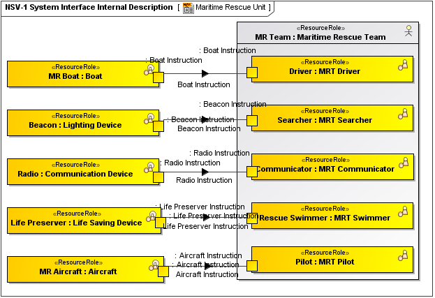 As depicted in the NSV-1, an interaction indicates that information passes from one resource to another. In the case of systems, this can be expanded into further detail in an NSV-2. Resource Exchanges are summarized in a Resource Exchanges Matrix (NSV-3).