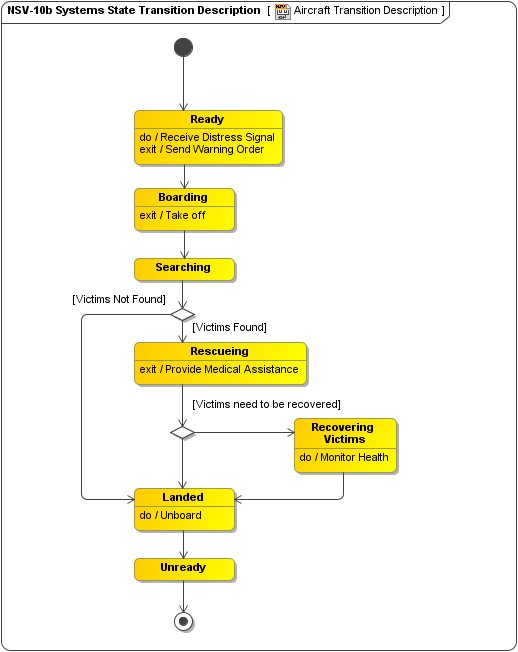 The NATO Systems State Transition Description (NSV-10b) is a graphical method of describing a ResourceType’s (or Function’s) response to various events by changing its state. The diagram basically represents the sets of events to which the subjects will respond (by taking an action to move to a new state) as a function of its current state. Each transition specifies an event and an action.