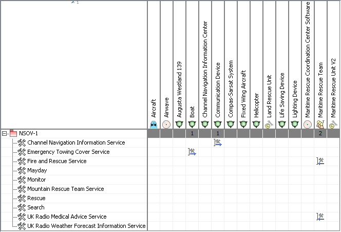 NSV-12 can be represented using a NSV-12 diagram which is an editable Dependency Matrix. The Service Interfaces will be used as the row elements and the Resources will be used as the column elements.