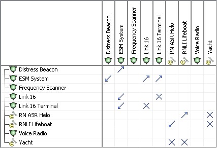 The NATO System to System Matrix provides a tabular summary of the resource interactions specified in the NSV1 for the Architecture. An NSV-3 Product allows a quick overview of all the resource interactions specified in one or more NSV-1 diagrams. The NSV-3 can be organized in a number of ways to emphasize the association of groups of system pairs in context with the architecture’s purpose.