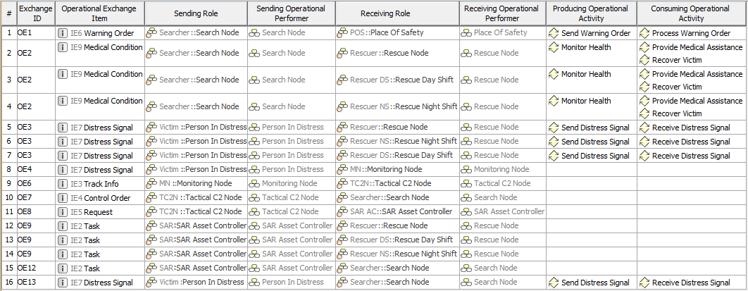 Operational Role-based Connectivity Table. A role-based table represents exchanges between Operational Roles.