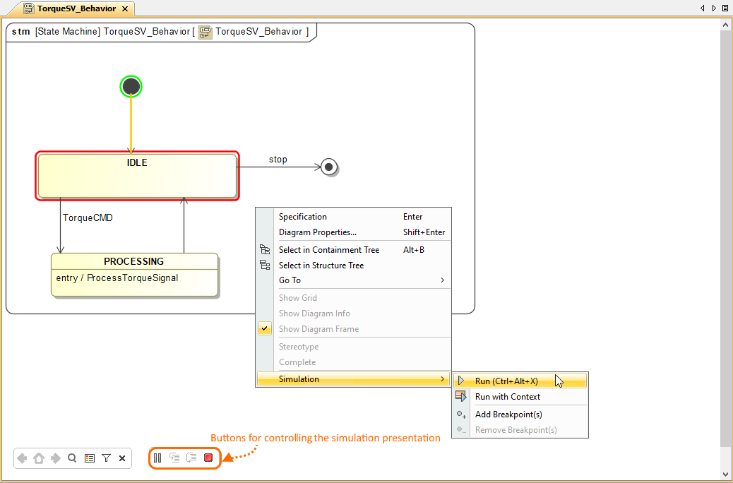 You can show diagram simulations in Presentation Mode as well. Once the simulation is started, a group of buttons for managing a simulation flow appears at the bottom of the window next to the Presentation Mode control buttons (see the diagram below).