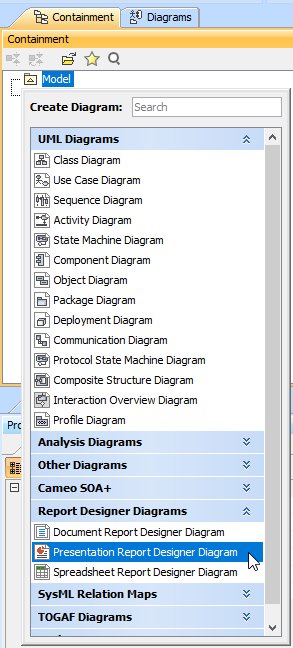 1. Right-click a Package in the Containment tree and select Report Designer Diagrams > Presentation Report Designer Diagram.