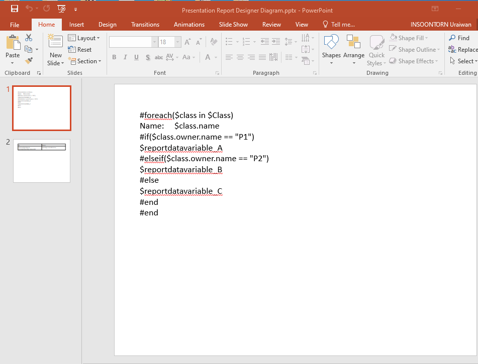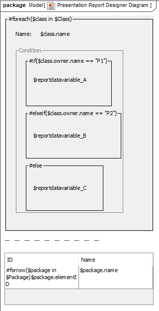 The Presentation Report Designer diagram provides many diagram elements represented in Velocity syntax/directive that can be created from the toolbar on the diagram. You can see diagram elements description in the Document Report Designer diagram page.