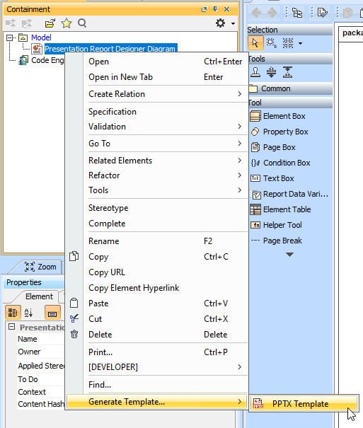 4. In the Containment tree, right-click Presentation Report Designer Diagram and select Generate Template > PPTX Template to generate the template.