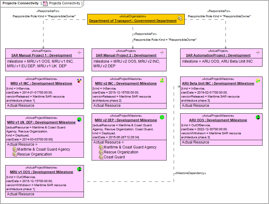 The Projects Connectivity (Pj-Cn) domain enables the user to model the organizational structures needed to manage programs, projects, portfolios, or initiatives. It shows dependency relationships between the actual organizations that own the programs, projects, portfolios, or initiatives. This model could be used to represent organizational relationships associated with transformation initiatives along with those who are responsible for managing programs, projects, and portfolios. The Projects Connectivity (Pj-Cn) domain provides a means of analyzing the main dependencies between acquisition elements or transformation elements.
