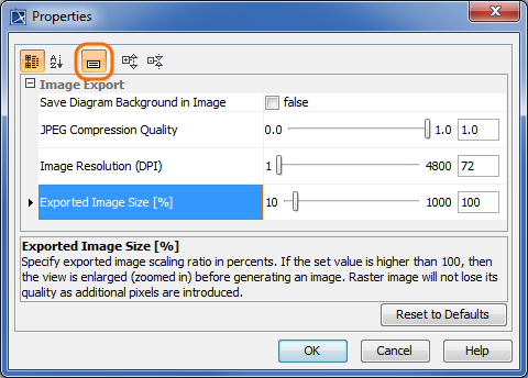 Default image export properties can be changed manually both via the Environment Options and the Project Options dialogs. To learn more, see the Diagram image export page.