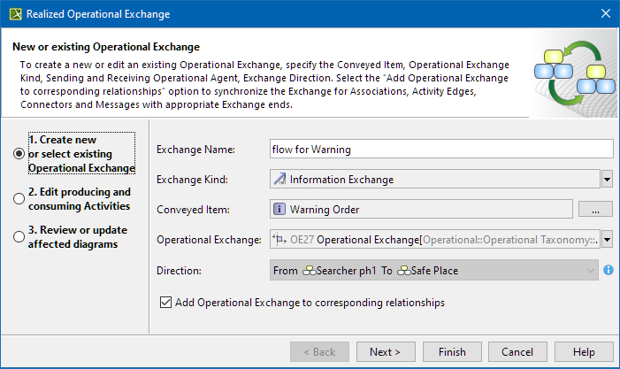 Add Operational Exchange to corresponding relationships | Select the check box if you want to add the Operational Exchange to the corresponding relationships with the same sending and receiving Operational Agents at their ends as defined in the first step of the wizard. |