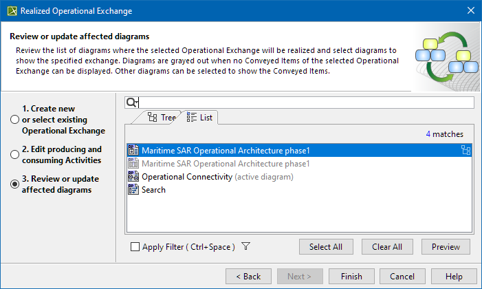 In this step, you can see the list of diagrams where the selected Operational Exchange can be realized and displayed. You can choose one or more diagrams you want the specified exchange to be displayed. If the diagrams are grayed out, this means there are no Conveyed Items of the selected Operational Exchange to be displayed.