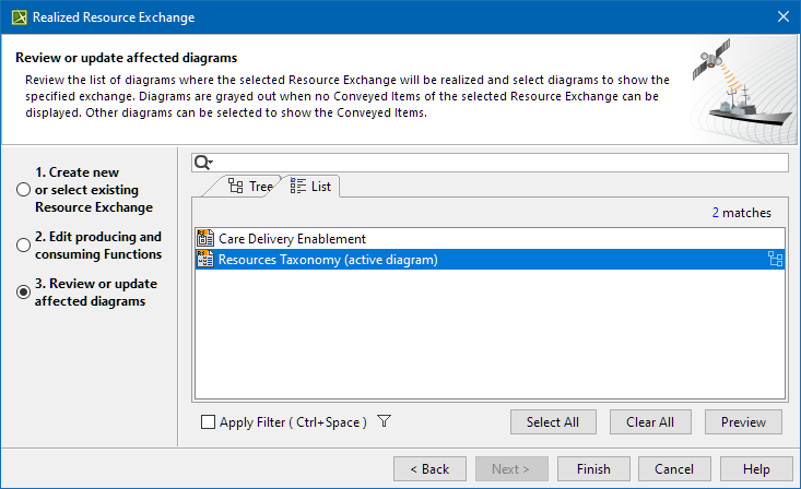 In this step, you can see the list of diagrams where the selected Resource Exchange can be realized and displayed. You can choose one or more diagrams you want the specified exchange to be displayed. If the diagrams are grayed out, this means there are no Conveyed Items of the selected Resource Exchange to be displayed.