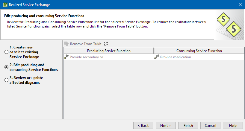 This step is designed to review Producing and Consuming Service Functions for the created or selected Service Exchange. Service Exchanges are produced and consumed by Service Functions performed by the Services. You can remove the realization between listed Service Function pairs.