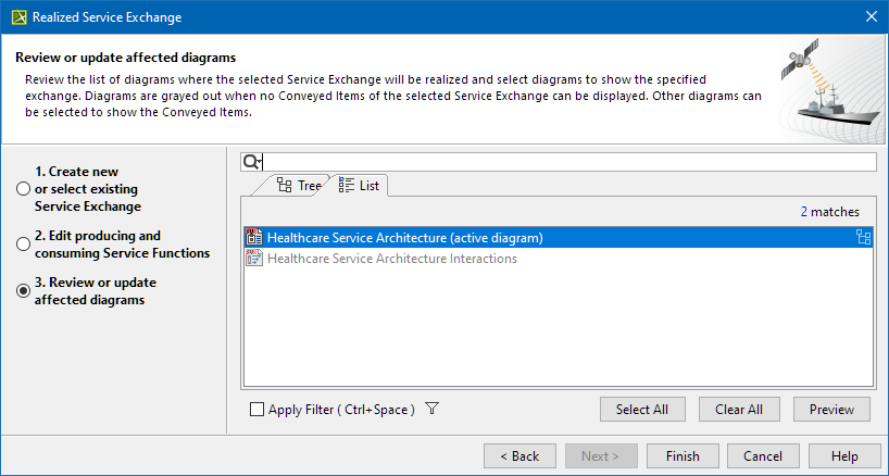 In this step, you can see the list of diagrams where the selected Service Exchange can be realized and displayed. You can choose one or more diagrams you want the specified exchange to be displayed. If the diagrams are grayed out, this means there are no Conveyed Items of the selected Service Exchange to be displayed.