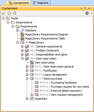 In the following figure, the Requirements are decomposed in the Containment tree. For example, the Item purchase Requirement is decomposed into four sub-Requirements: Purchasing facilitation, Purchase request for new items, External global repository, and Item request management.