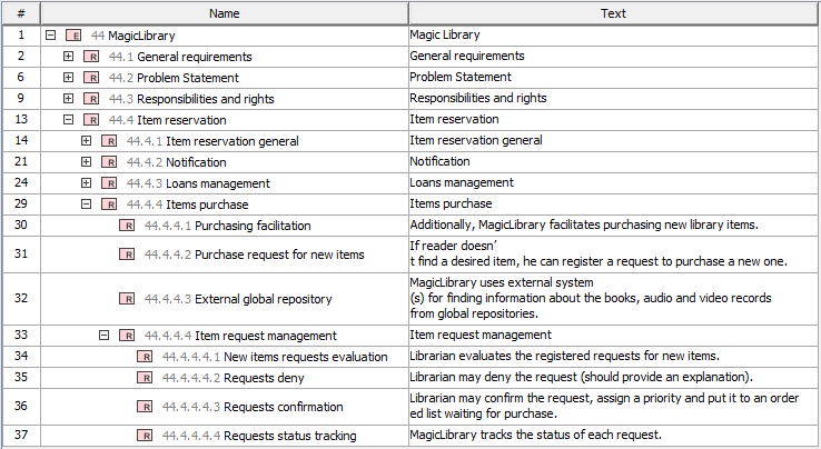 In the following figure, the Requirements are decomposed and displayed hierarchically in the Requirement Table. For example, the Item purchase Requirement is decomposed into four sub-Requirements: Purchasing facilitation, Purchase request for new items, External global repository, and Item request management.