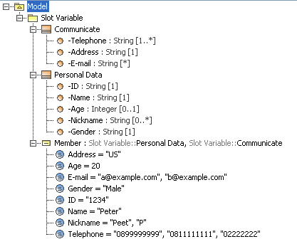 For example, if you want to retrieve the values of a slot whose name is “Address” and those of a classifier whose name is “Communicate”, type: