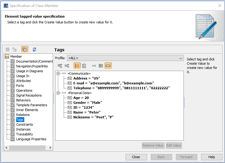 For example, if you want to retrieve the values of a tag named Address and those of a tag stereotype named Communicate, type the following lines:
