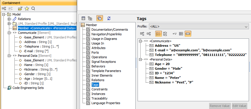 - A tag value named TagName and a tag stereotype named StereotypeName.