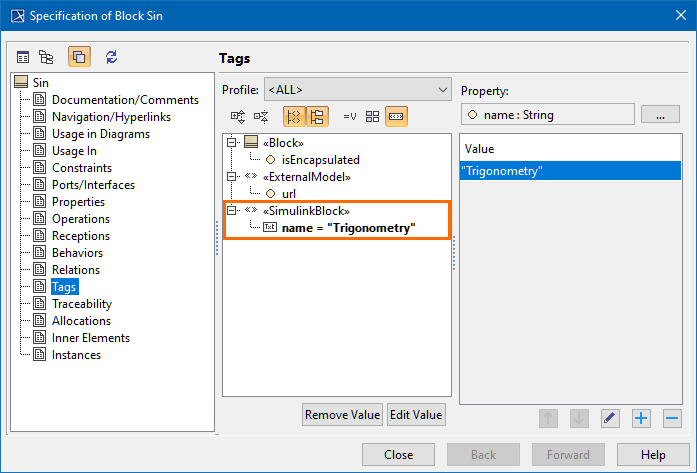 Apply the «SimulinkBlock» stereotype for a Block to reference its Part Properties with an equivalent component in Simulink. The value of the name tag must be a type of a Simulink Block (e.g. "Trigonometry").