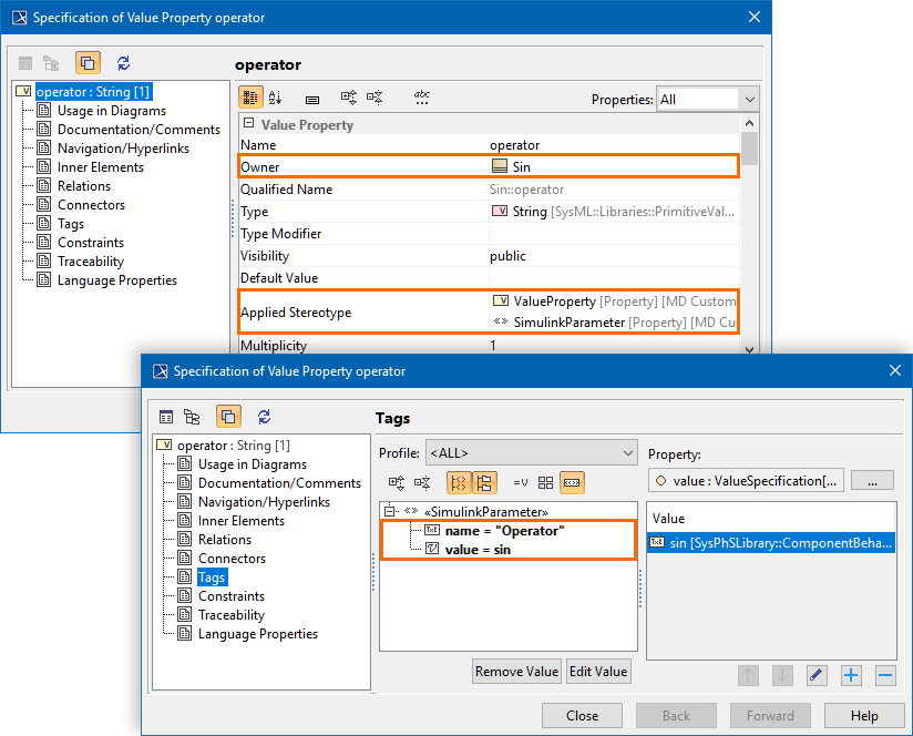 The «SimulinkBlock» Sin owns operator Value Property stereotyped by «SimulinkParameter» with a reference to the Simulink library component.