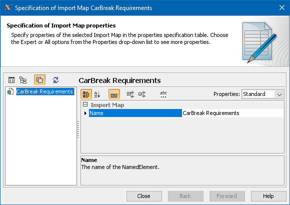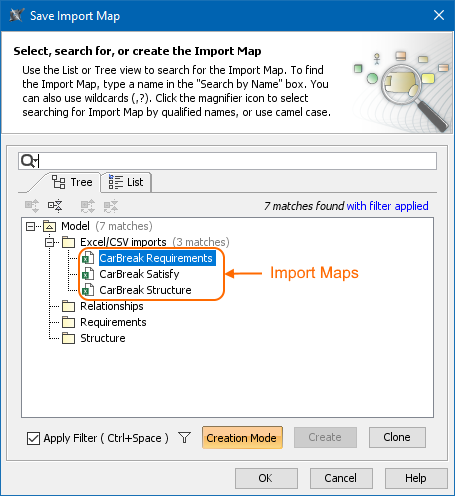 An Import Map is a single instance of mapping between Excel or CSV file data and exported elements. Once you saved the Import Map, you can reuse it when importing data by using a single map or a group of maps. Also, you can override an existing Import Maps instead of creating new ones if changes are required. As an example, in the image below, the new CarBreak Requirements Import map is saved under the Excel/CSV imports Package. This Package is created automatically when saving your first Import Map.