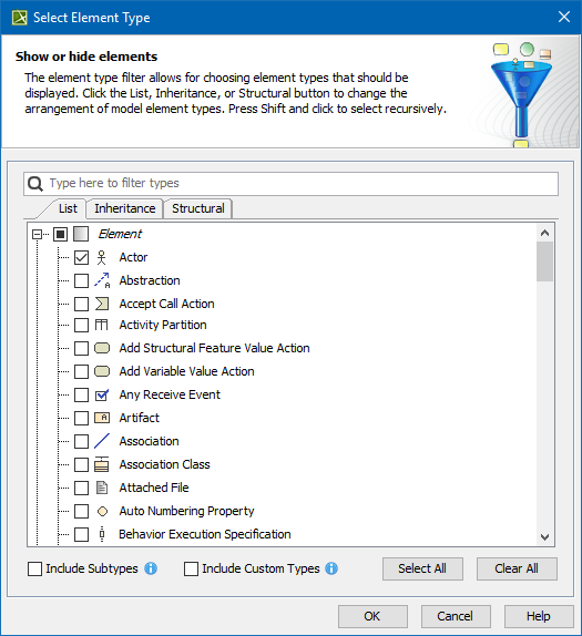 - Select the Include subtypes check box to display the subtypes of the selected element types.