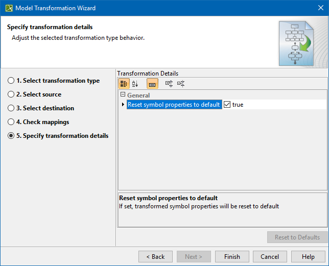 The Transformation Details panel displays the various properties of a specific transformation, selected in the first step of the Model Transformation Wizard. Each transformation type has its own set of options, which govern functionality of that transformation.