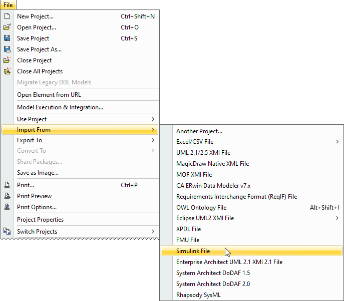 - In the top-left corner of the modeling tool, click File > Import From > Simulink File.