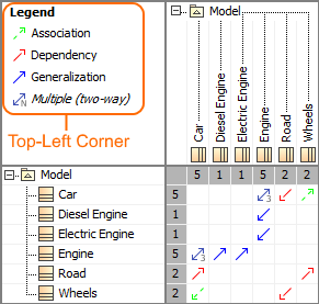 Your selection is shown in the customized legend in the top-left corner or above the matrix. The legend is displayed by default in all new projects, but if you don't want to see it all the time, simply click the button in the (2026x) Dependency Matrix toolbar and then click Legend Location > Do Not Display.