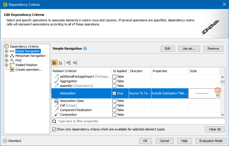 You can specify the colors, line styles, or, alternatively, set an icon for the representation of your relationships in Dependency Matrices. To be able to do this, you need to access the Style dialog in the first place.