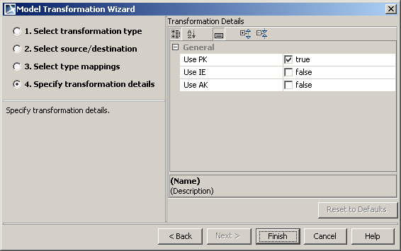 | Use AK | Check box | If set to “true”, unique columns with the alternative key stereotype are marked after transformation. |