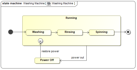 State Machine. The State Machine is a specification of the sequence of states an object or an interaction undergoes in response to events during its life, combined with its responsive actions. The State Machine can represent the sequence of states of a particular collaboration, e.g. collection of objects, or even the whole system, which is also considered a collaboration. The abstraction of all possible states defined in a State Machine is similar to the way Class diagrams are abstracted: all possible object types (classes) of a particular system are described.