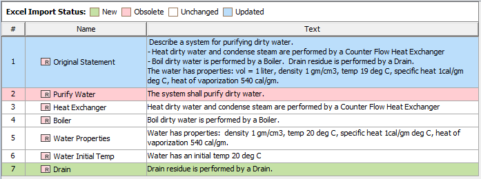 If you made changes in the file and saved them, the table Legend displays automatically and highlights the New, Obsolete, Unchanged, and Updated rows. In the figure above, the first requirement is updated, the seventh is newly created, and the second is deleted. All the items in the table are highlighted. The legend above reveals that all new items are highlighted like this. You can change the legend colors or hide the legend from the table. Learn more about legends >>