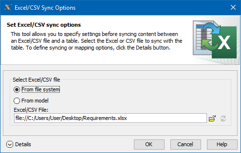 - You can link only one Excel/CSV file with the same modeling tool table.- Click Details to expand the dialog.