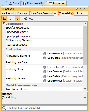 The Traceability tab in the element’s Properties panel (at the bottom of the Browser window) is one of the places, wherein the element’s traceability properties, showing its realizing and/or more specific elements, are represented.