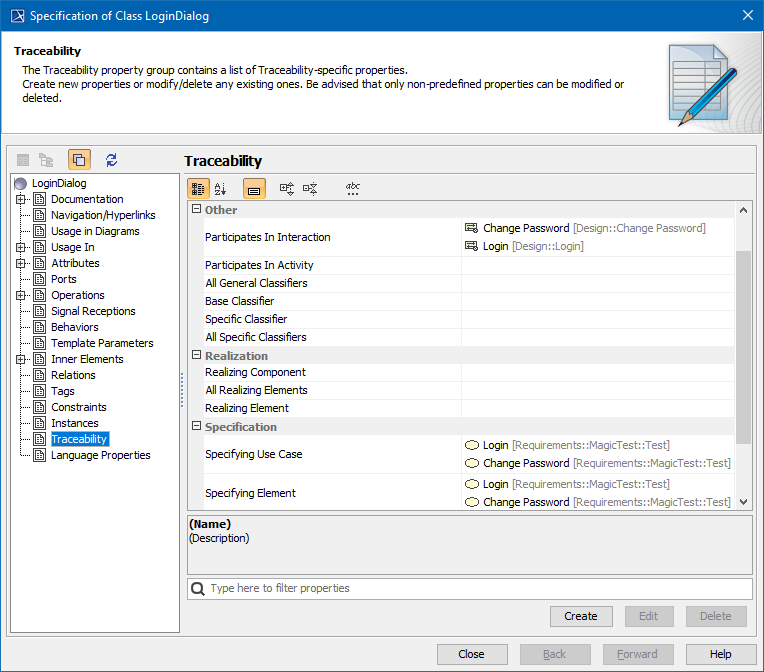 Therefore, the traceability properties such as Realizing Class and Realizing Element represent both design classes as realizing elements of this use case. Accordingly, the traceability properties such as Specifying Use Case of each design class represent the “Create User” use case as a more specific element.