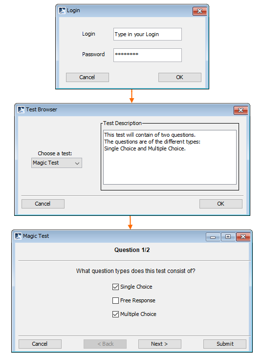User Interface Modeling allows you to create browsable reports. You can create a hyperlink from the UI model element to the report. Once a report of these models has been created, click on any element in the report. You will then be directed to the other diagram. When you click OK in the upper left-hand frame you will be directed to the next frame. After clicking OK in that frame, you can get to a couple of frames from which you can step forward and backward as you want, as they are all linked to one another.