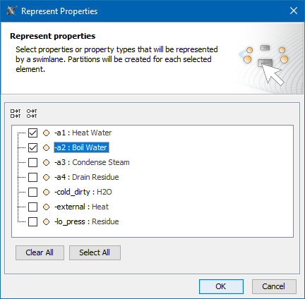 1. Click the Vertical Swimlanes button on the activity diagram palette and then click an empty space on that diagram pane. The Represent Properties dialog opens.