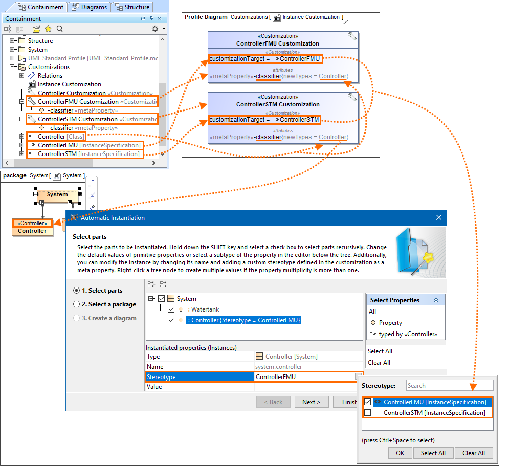 The custom «ControllerFMU» and «ControllerSTM» stereotypes have Instance Specification as their metaclass